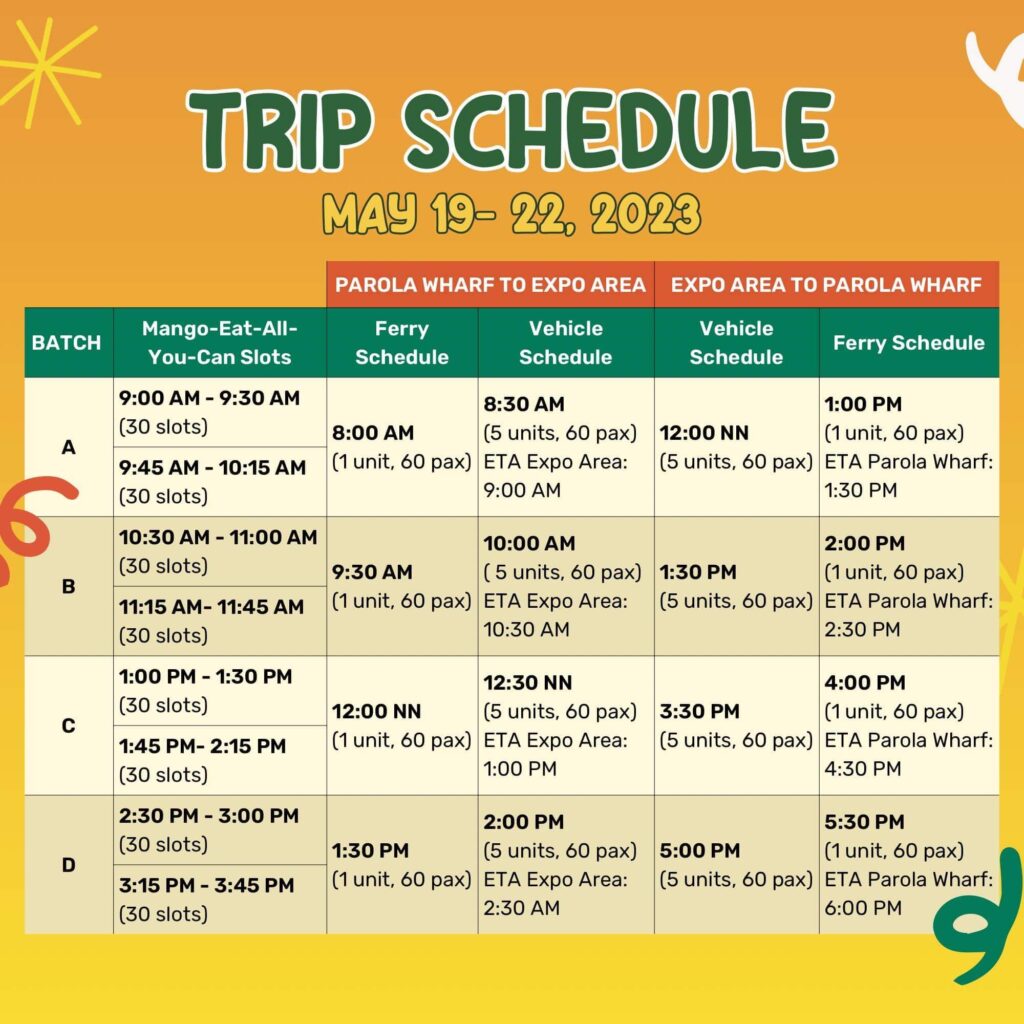 To provide a less hassle and time-efficient transportation system for clients purchasing the Manggahan Festival VIP Packages, the following Mango-Eat-All-You-Can and Transportation Schedule are available.