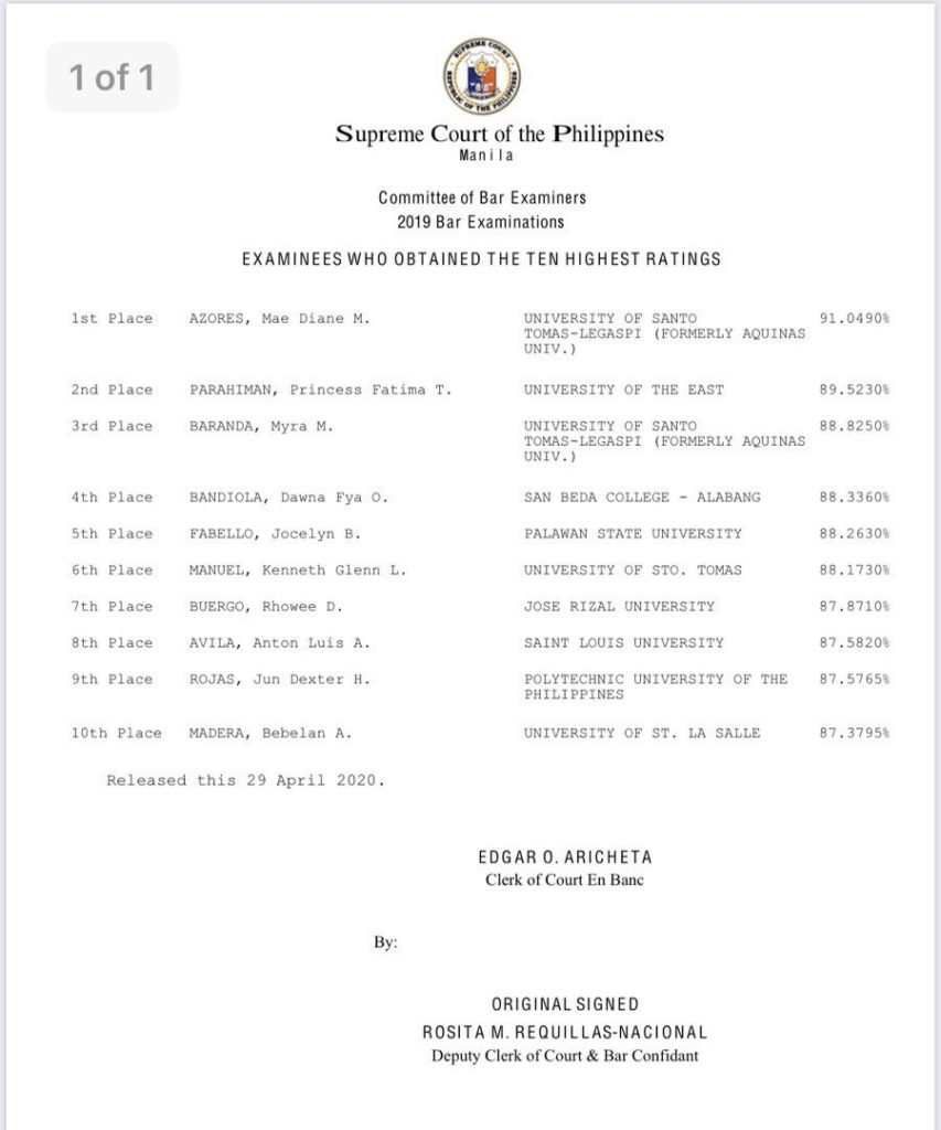 The High Court will be releasing the complete list of passers in a while and will be made available only via online. Complete list of passers below. Meanwhile, here are the topnotchers: