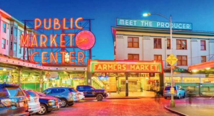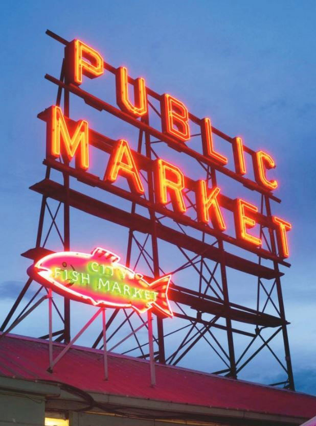 Recently, Pike Place Market opened the WaterFront, a new public space that extends the market down Seattle’s waterfront. The expansion included a new plaza, art installation, retail and commercial establishments, revitalizing the waterfront area and providing new opportunities for the vendors and visitors alike. Its famous Public Market Center Clock & Sign also underwent a period of restoration such that its neon lights are shining very bright today.