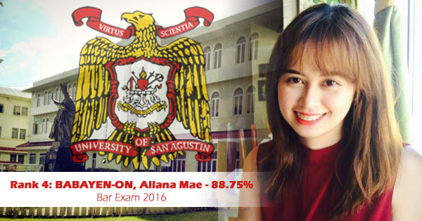 A law graduate of University of San Agustin is one of the topnotchers in the recently released Bar Exam 2016.