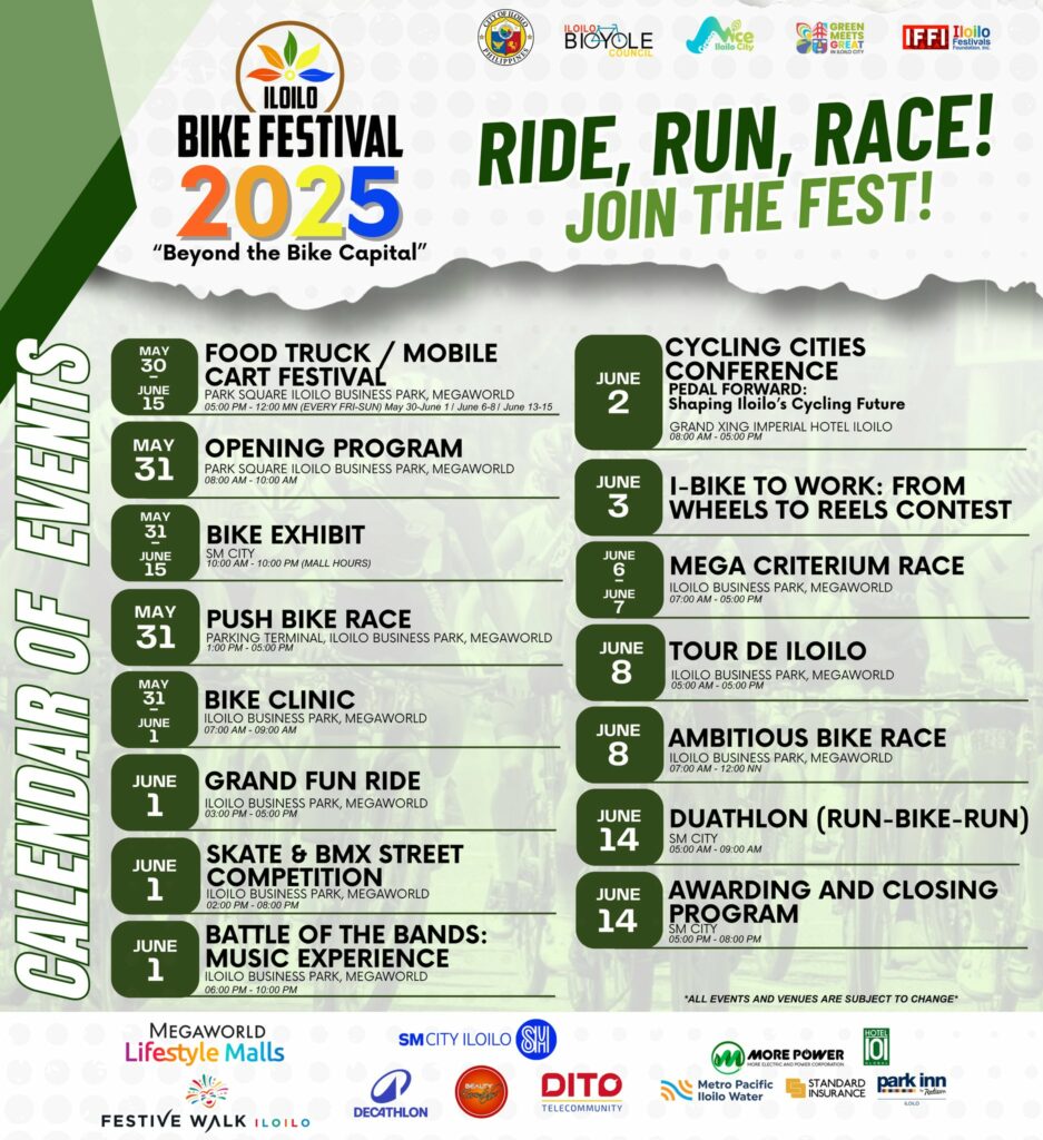 For the full updated schedule of the Iloilo Bike Festival 2025 events and their respective venues, visit [https://web.facebook.com/ibikeiloilo](https://web.facebook.com/ibikeiloilo). 📸 R.J. Tarrosa/Iloilo City PIO & Ronabel Jane Abeto/SPES