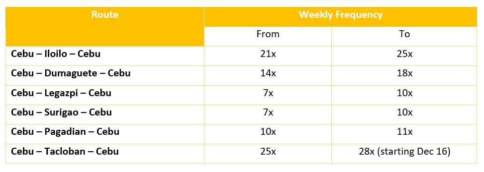 Here are the domestic destinations with additional flights to and from Cebu starting December 1:
