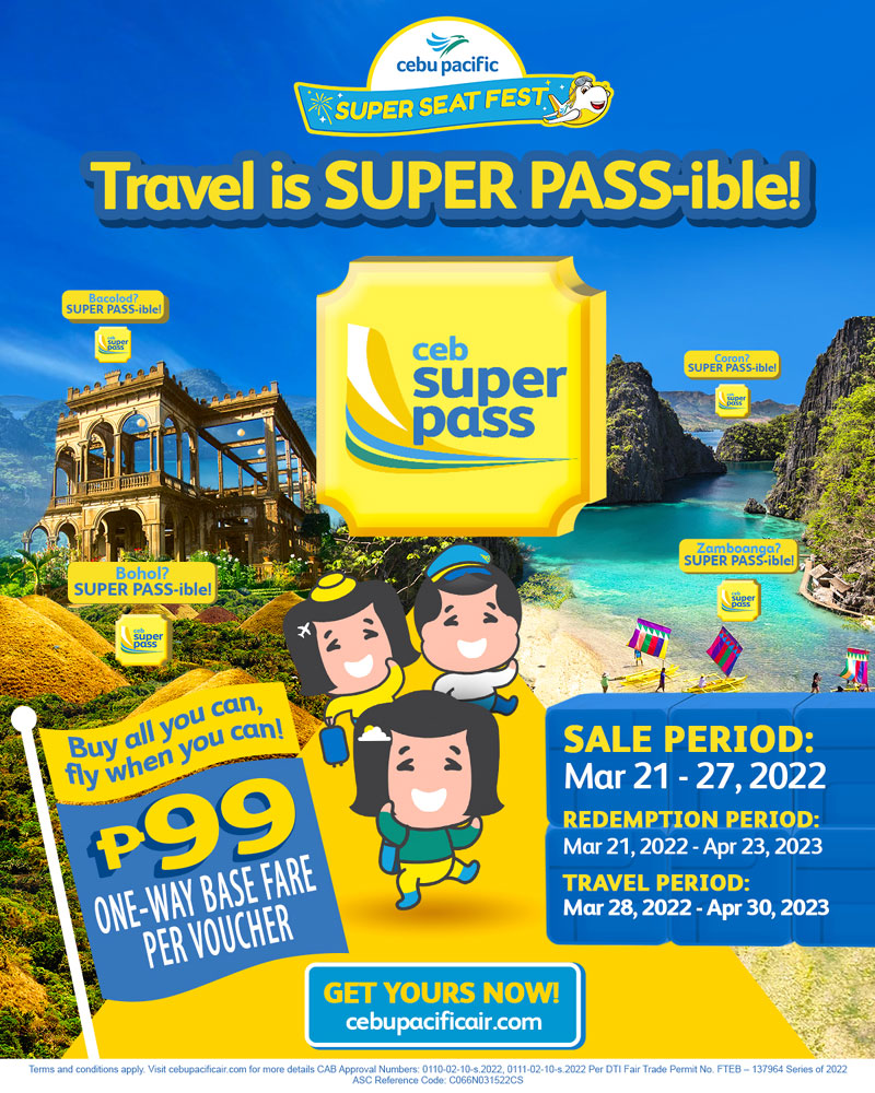 As travel restrictions continue to ease following the decline of COVID cases across the country, CEB is gearing up to cater to every Juan’s long-overdue travel plans. For just 99 pesos (one-way base fare), the CEB Super Pass gives passengers the flexibility, convenience, and affordability to revisit their favorite PH destinations, or explore new places across the airline’s widest domestic network, whenever they like – from March 28, 2022, all the way until April 30, 2023.