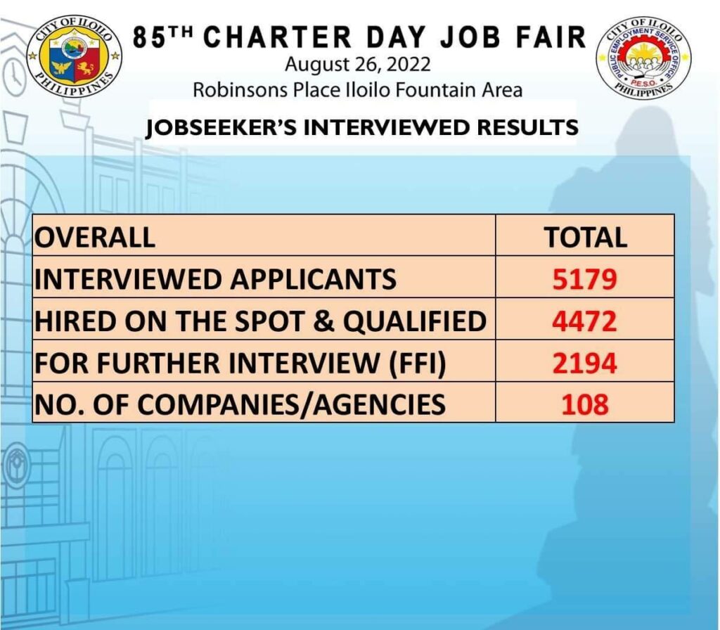 Around 4,500 Ilonggos were hired on the spot during the 85th Charter Day Job Fair 2022 held at Robinsons Place Iloilo on August 26, 2022.