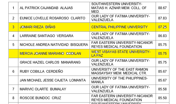 Central Philippine University (CPU) graduate Jomari Rieza Biñas scored 87.25 percent to get the top 3 ranking, while Mercia Joanne Mariano Codilan of West Visayas State University (WVSU) got 85.75 percent rating to rank no. 5.