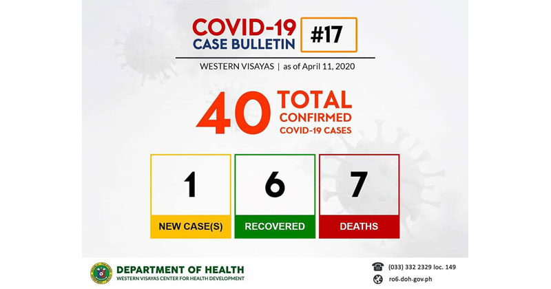 This brings the total to 40 confirmed cases of COVID-19 in the region. Iloilo Province still has the highest cases at 15, followed by Bacolod City at 7, then by Aklan at 6, Iloilo City with 5, Capiz with 4, Antique with 2, and Negros Occidental with 1 case.