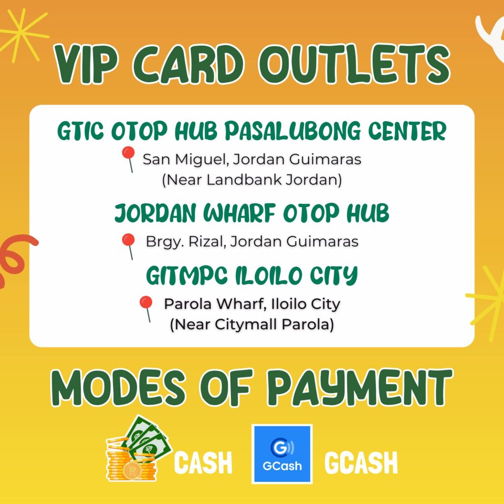 ● Manggahan Festival VIP Card will be issued at partner stores: Guimaras OTOP Hub/Pasalubong Center, Jordan OTOP Hub, Jordan Wharf and GITMPC Ticketing Outlet in Parola Wharf, Iloilo City.
