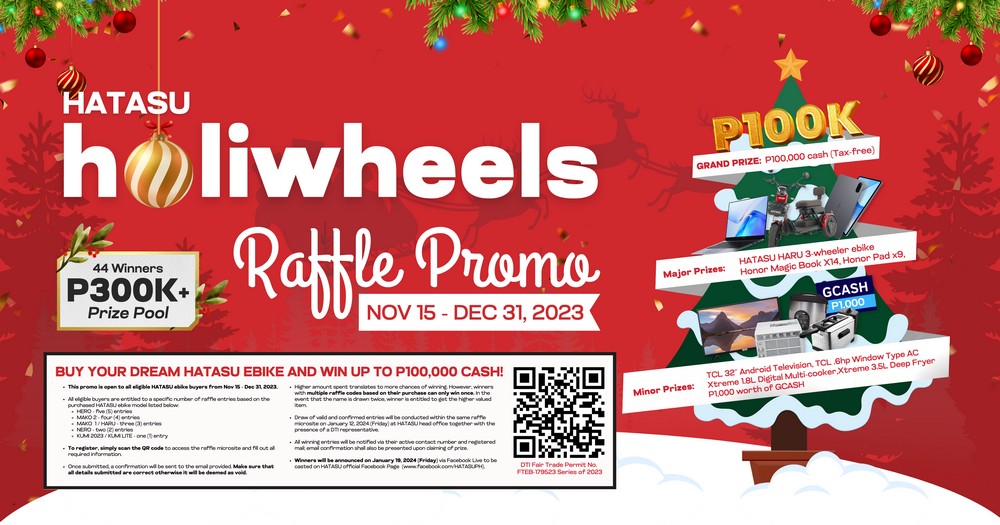 In celebration of its first-year anniversary, HATASU ebike is spearheading its first nationwide raffle promo too! Racking up a prize pool of over P300k, the promo will run from November 15 to December 31, 2023. Get the chance to win P100,000 Cash prize, a brand new HATASU HARU ebike and other amazing prizes. A total of 44 winners will be drawn so visit the @HATASUPH Facebook page to learn more about the mechanics!