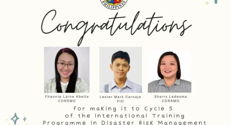 Iloilo City Government congratulates Lester Mark Carnaje of Public Information Office (PIO), and Fhannie Laine Abella and Sharry Ledesma of the City Disaster Risk Reduction and Management Office (CDRRMO) for having been selected to participate in Cycle 5 of the International Training Program in Disaster Risk Management (ITP-DRM) of the Swedish Civil Contingencies (MSB).