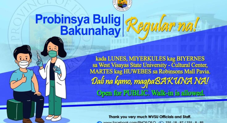 Iloilo Provincial Health Office (IPHO) announced that beginning Monday, January 10, there will be regular COVID-19 vaccination at West Visayas State University (WVSU) Cultural Center every Monday, Wednesday and Friday and at Robinsons Place Pavia in Ungka every Tuesday and Thursday