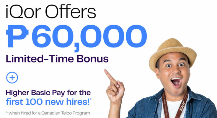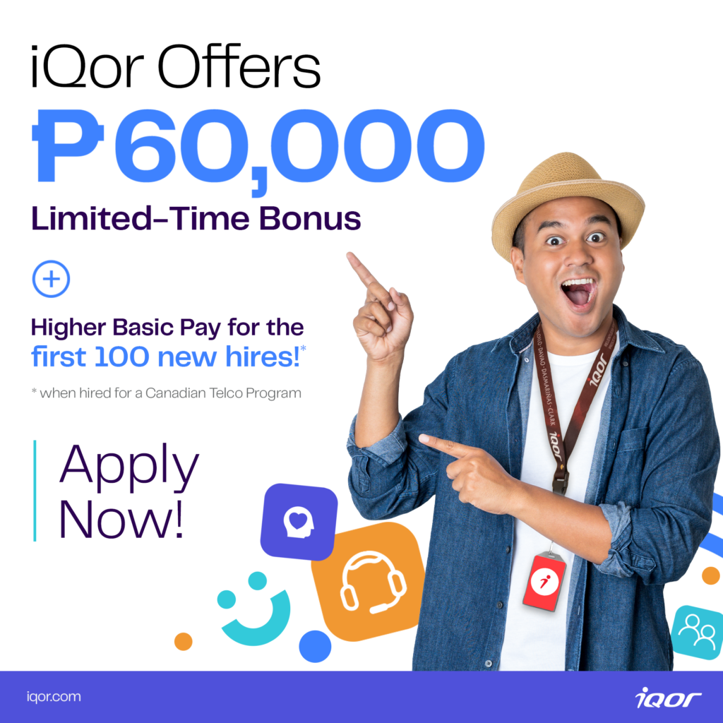 Working at iQor has many benefits! The first 100 new hires to join an exciting Canadian telecommunications program will receive a limited-time bonus of 60K pesos. Employees will earn higher basic pay plus a non-taxable allowance. Employees will also receive free HMO health care coverage starting on Day 1 for themselves and three dependents. Employees receive monthly performance incentives and quarterly appraisals. They also receive up to 30 days of paid leave with up to 21 days convertible to cash.