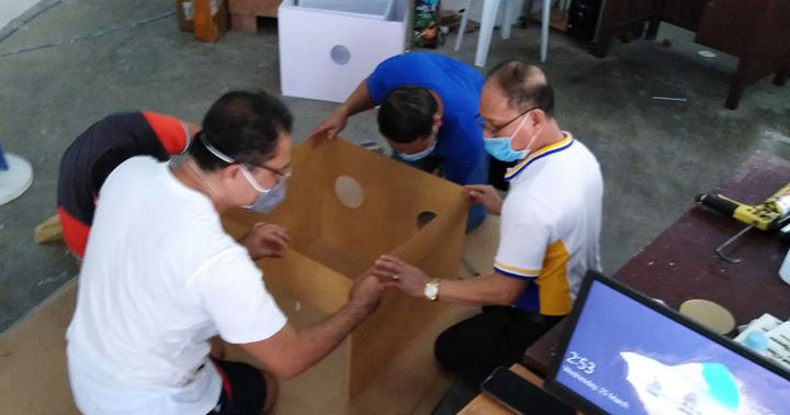 In a photo shared by Professor John Eric Juaneza in Facebook, Muyong is seen helping other school officials and educators in the production of improvised aerosol boxes which will be donated for medical workers.
