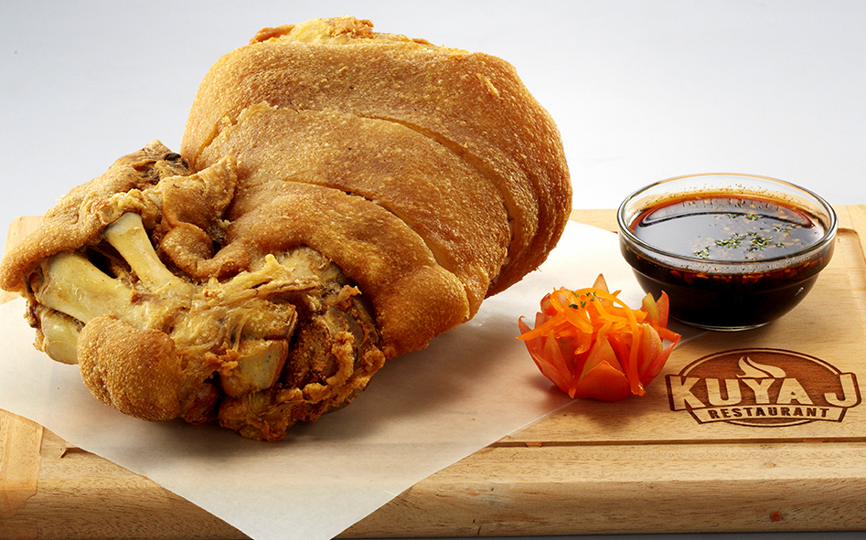 Kuya J specialty Crispy Pata, with perfectly deep-fried pork skin and tender juicy pata meat.