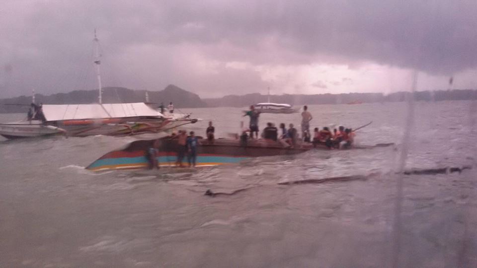 Facebook user Mark Provido Piad shared on social media photos of the toppled boat with some passengers hanging onto it.