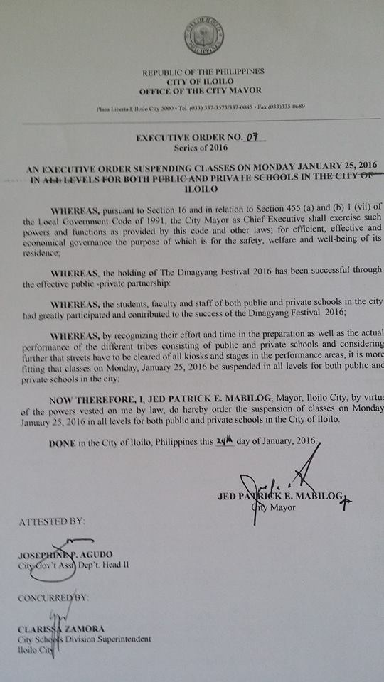 Mayor Jed Patrick E. Mabilog has announced the cancellation of classes for both public and private schools in all level in Iloilo City on Monday, January 25, 2016 in recognition of students, faculty and staff’s contribution to the success of Dinagyang Festival.