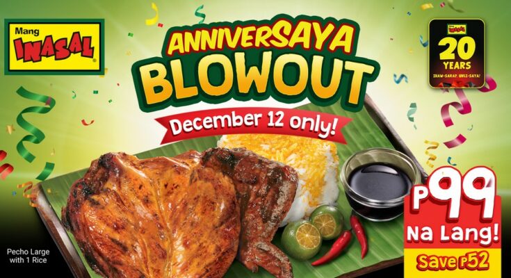On December 12, Mang Inasal will offer its customers nationwide a one-day AnniverSAYA Blowout with Chicken Inasal Large Paa or Pecho with rice for only ₱99. Enjoy savings of up to P52!