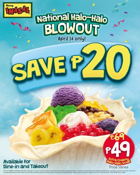 May be an image of ice cream and text that says “INASAL Mang National Halo- Halo BLOWOUT April 14 only! SAVE SAVEP20 20 Available for Dine-in and Takeout P69 49 Extra Creamy Halo-Halo Small Price Varies”