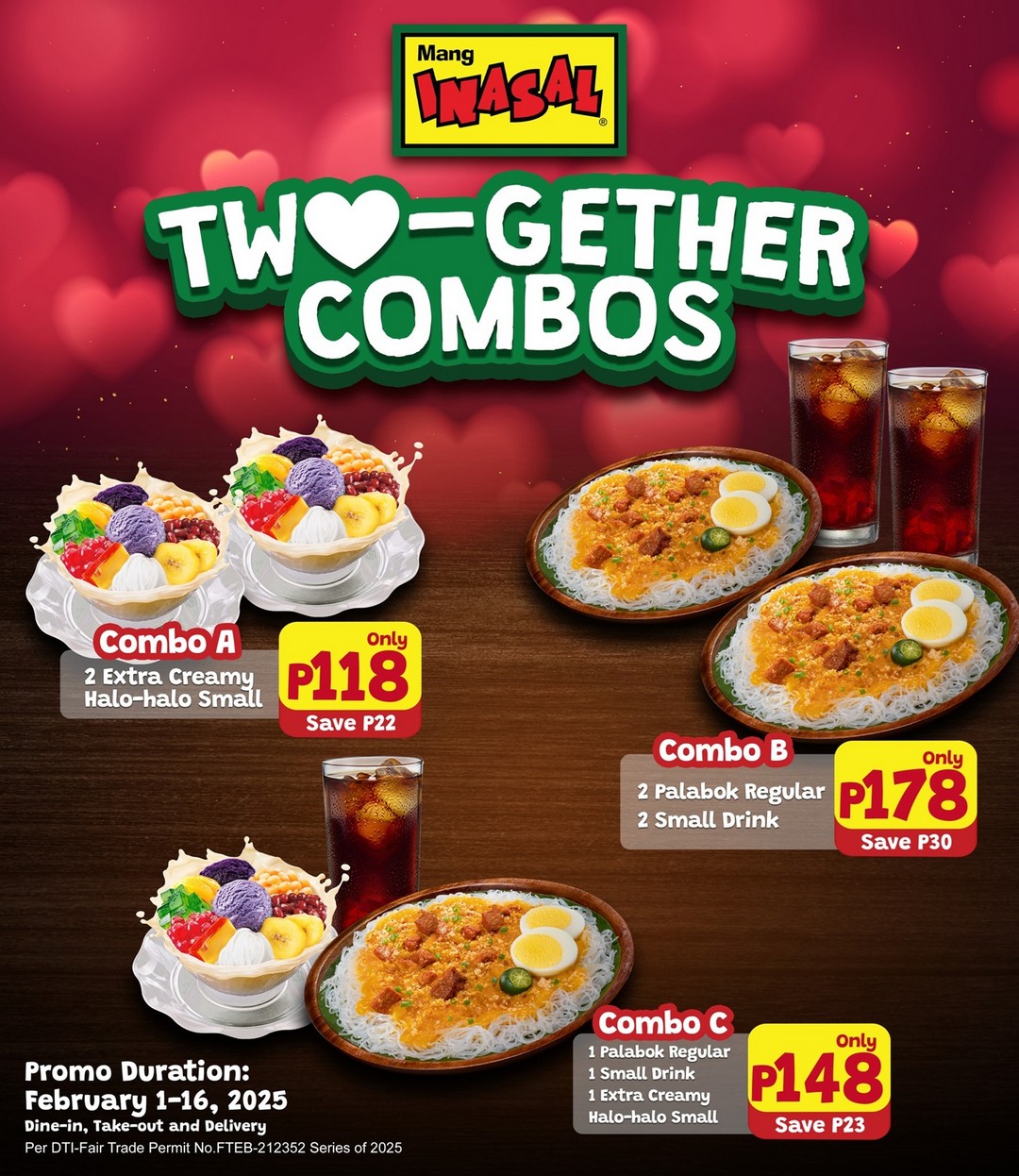 Running from February 1 to 16, the promo includes Combo A with two Extra Creamy Halo-Halo (Small) for ₱118, Combo B with two Palabok Regular and two Small Drinks for ₱178, and Combo C with one Palabok Regular, one Small Drink, and one Extra Creamy Halo-Halo (Small) for ₱148. These deals are available via dine-in, takeout, and delivery at all Mang Inasal stores nationwide.