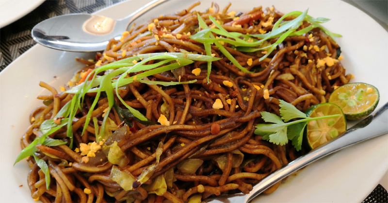 Singaporean Noodles: Stir-fried rice noodles with vegetables, seasoned with madras curry powder with a hint of calamansi.
