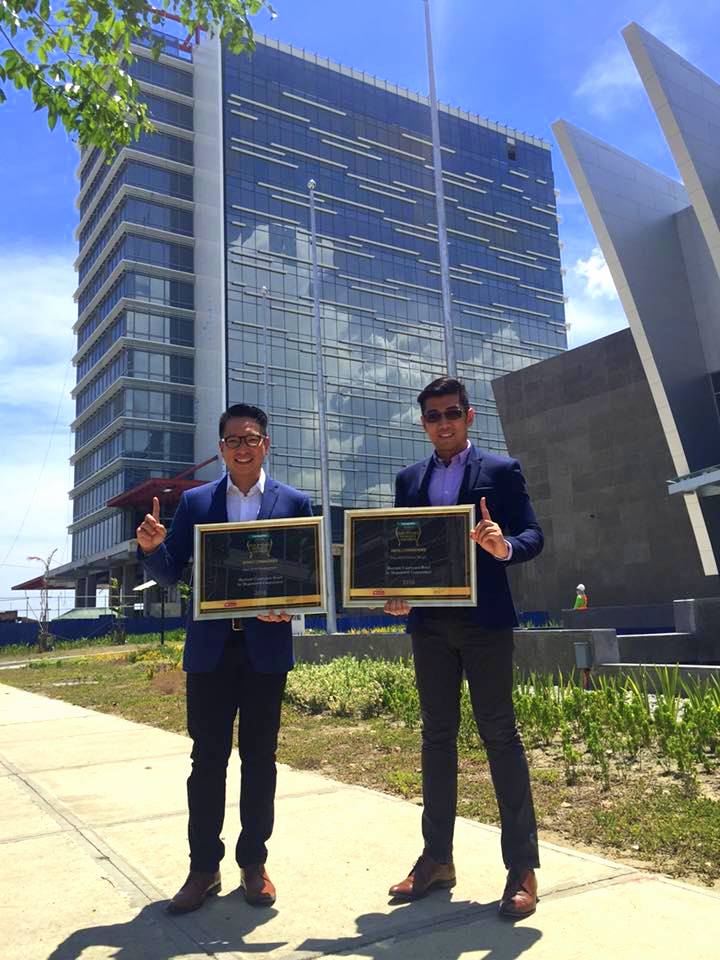 Megaworld senior vice president Jericho Go (left) and AVP and head of public relations and communications Harold Geronimo (right) show the two awards received by Marriott Courtyard Hotel at the prestigious 2016 Philippines Property Awards held in Makati City recently. The 15-story first-class hotel (on background) bagged ‘Highly Commended’ awards for ‘Best Hotel Development’ and ‘Best Hotel Interior Design,’ among other hotel developments in the country.