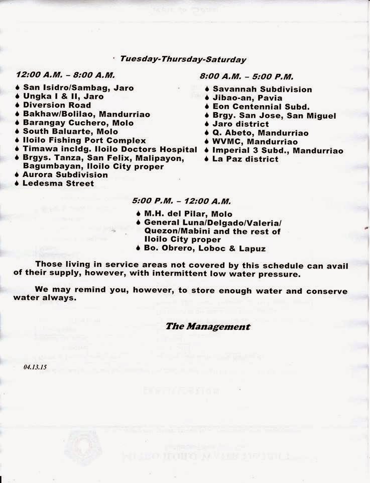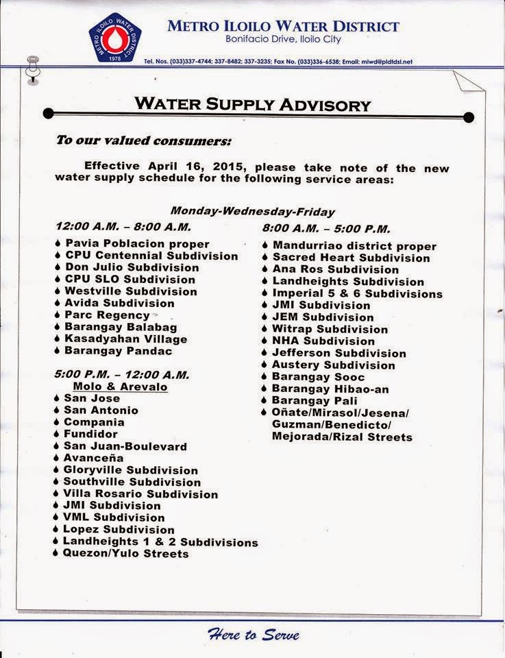 Metro Iloilo Water District (MIWD) will start ‘rationing’ its water supply to consumers on April 16, 2015. Check the schedule below.