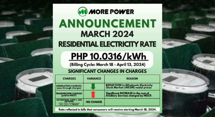 The distribution utility said that the increase of P0.06 per kilowatt-hour to be reflected in billing this March 2024 is due to additional P0.18 per kWh charge of NGCP from the cost of Ancillary Services.