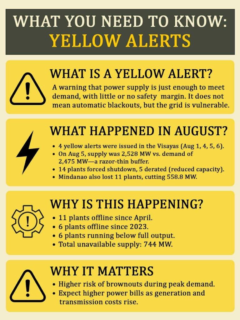 If you live in the Visayas and felt uneasy about your electricity this August, you had every reason to. From August 1 to 6, the National Grid Corporation of the Philippines (NGCP) issued not one, but four yellow alerts. For those who don’t live and breathe power industry jargon, a yellow warning is the grid’s way of saying: “We’re cutting it close—one more problem and we’re in trouble.”