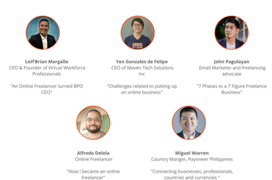 Speakers at the Payoneer Forum Iloilo include Lief Brian Margallo, CEO & Founder of Virtual Workforce Professionals; Yen Gonzales de Felipe, CEO of Maven Tech Solutions Inc.; Alfredo Delola- Freelancer and; John Pagulayan- Email Marketer and freelancing advocate.