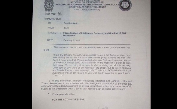 Albayalde was referring to a picture of a PNP memorandum which circulated online, ordering an intensified intelligence gathering and conduct of risk assessment in response to information claiming that the Abu Sayyaf Group is threatening to bomb SM malls.