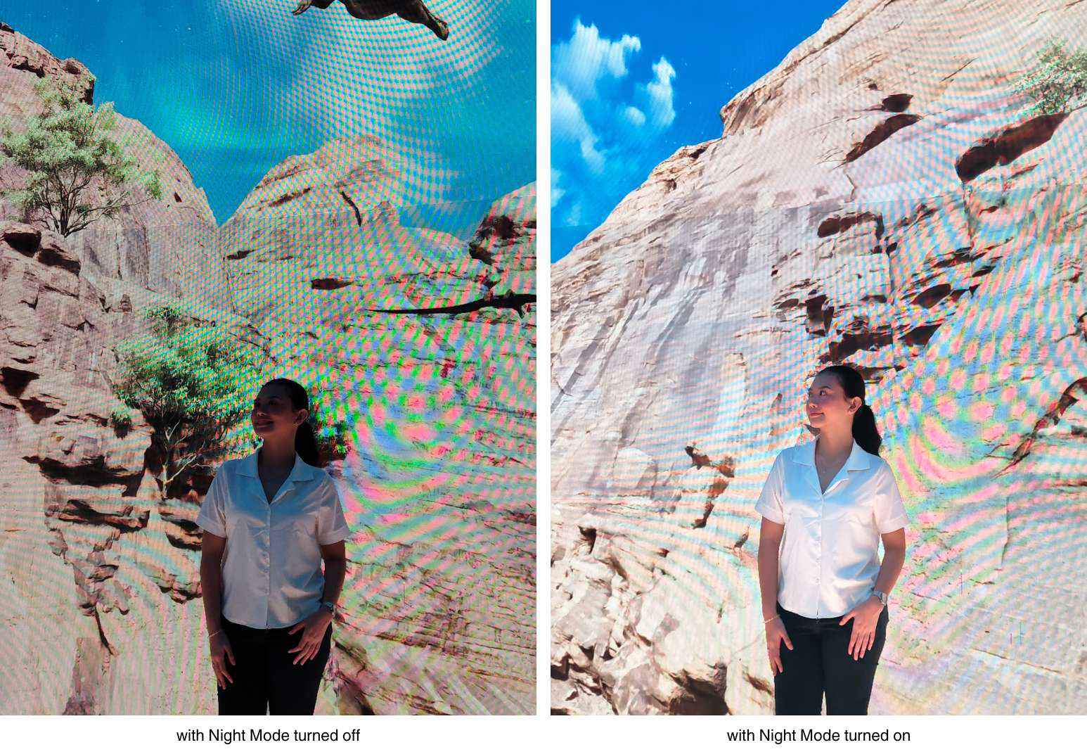 Take, for example, the photos below taken in a dome-shaped room with a bright LED backdrop. In the left picture, taken in standard photo mode, the room’s darkness overwhelms the subject, leaving them barely visible against the LED backdrop.