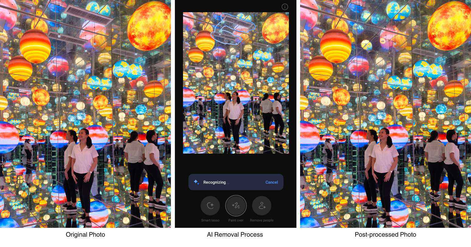 AI Smart Removal is a handy post-processing tool that simplifies photo editing. To use it, simply open the gallery, select the desired photo, and tap Edit. From the editing menu, choose AI Eraser, then use the Smart Lasso feature to outline and identify the object that needs to be removed.