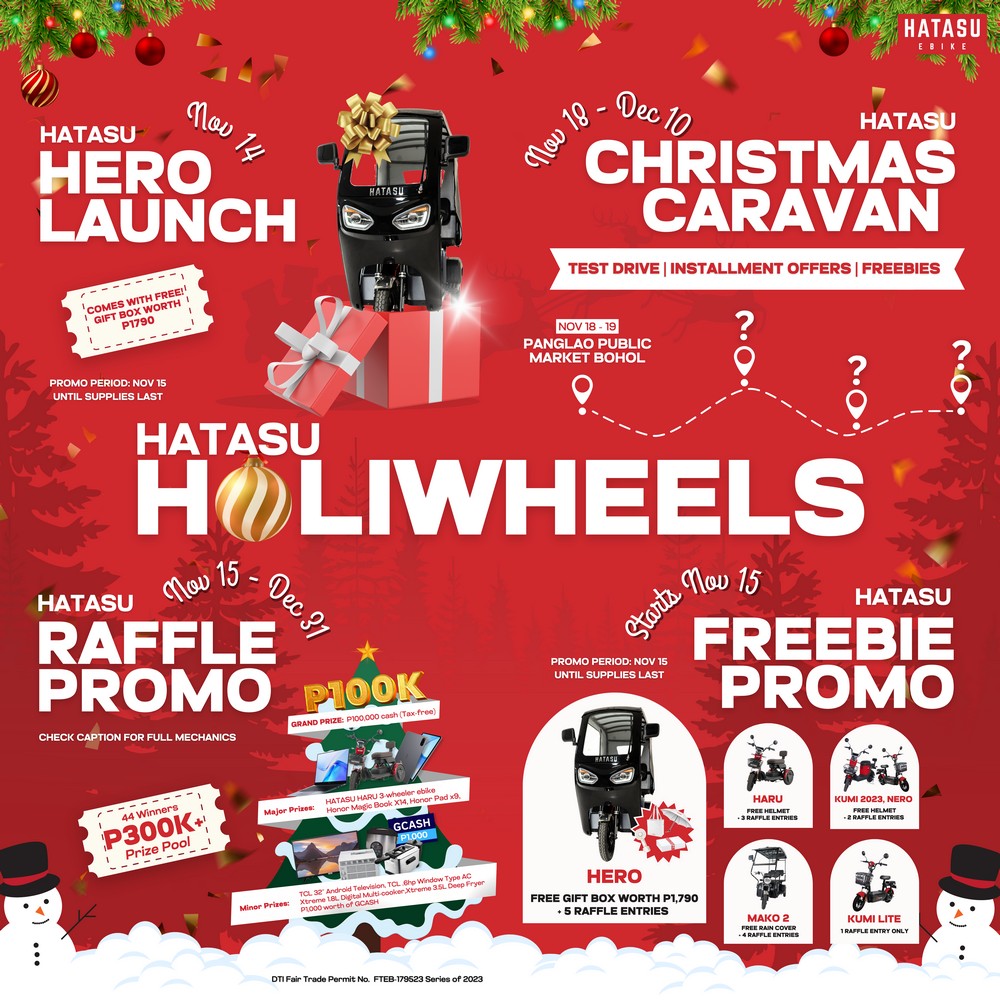 Hop on a holiday adventure with HATASU ebike and earn multiple chances to win when you purchase your dream HATASU ebike from November 15 to December 31, 2023 at all their participating stores and authorized dealers nationwide which you can check in this link. Be sure to check this post (link) to find out how to join.