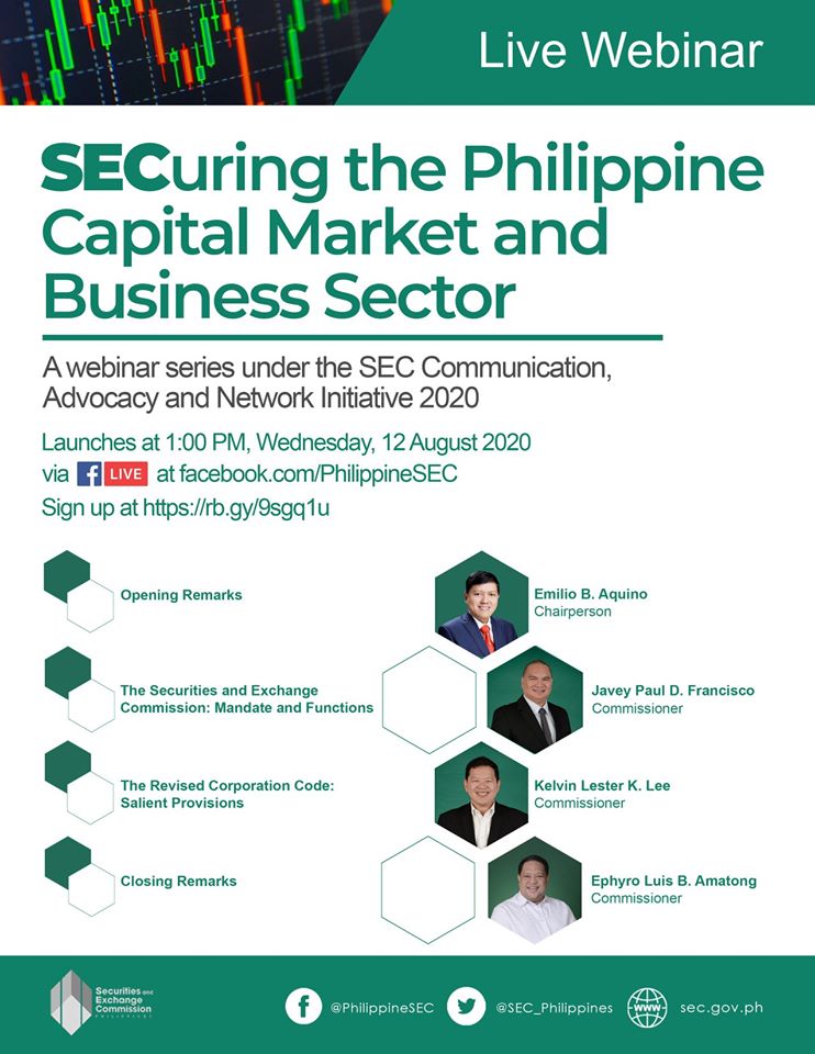 The Securities and Exchange Commission (SEC) is inviting all registered corporations to join the Commission’s free webinar entitled SECuring the Philippine Capital Market and Business Sector, a webinar series under the SEC Communication, Advocacy and Network Initiative 2020, at 1:00PM on Wednesday, 12 August 2020.