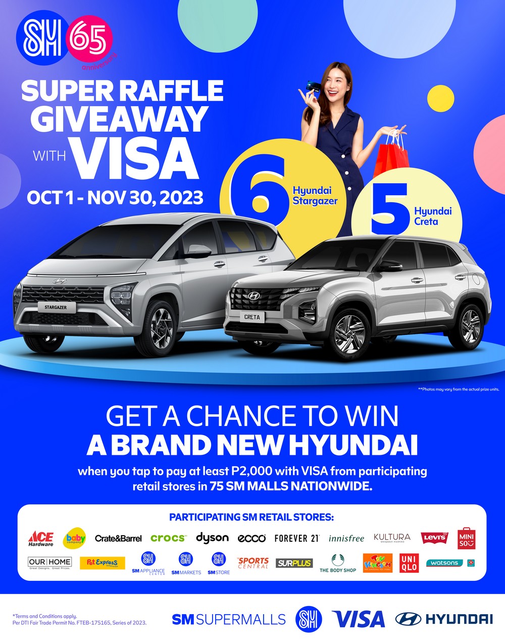 From October 1 to November 30, eleven lucky shoppers can get a chance to drive away in style at SM’s Super Raffle Giveaway with VISA. All you need to do is to shop for a minimum single receipt purchase of Php 2,000 via tap to pay using your VISA card at participating SM Retail Stores in 75 SM Malls nationwide. Get a chance to win one of the six (6) brand-new Hyundai Stargazers and one of the five (5) brand-new Hyundai Cretas. These brand-new Hyundai cars will really make your daily commute a super experience so shop till you drop and maybe drive away with a new set of wheels!