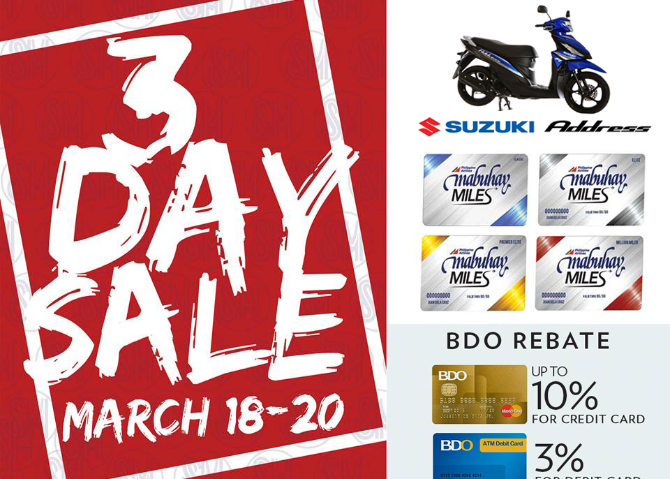 On March 18, there will be a SMAC Sale from 9am to 12 noon. SM Prestige and SM Advantage Card members will enjoy an extra 10% off on all items sold at SM Department Store, Ace Hardware, Our Home, Adidas, Surplus Shop & Toy Kingdom; and an additional 5% discount at SM Appliance Center.