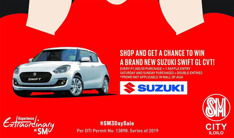 Enjoy the exciting activities in store during the 3 Day Sale, such as store mascots parade, hourly freebies and the Ball Toss game for a chance to win the first 100 prizes per day. Just present any receipt purchased during the 3 Day Sale to play the Ball Toss game at the Northpoint of SM City Iloilo. Plus, you also get a chance to win a Suzuki Swift GL CVT for every P1,000 single-receipt purchase.