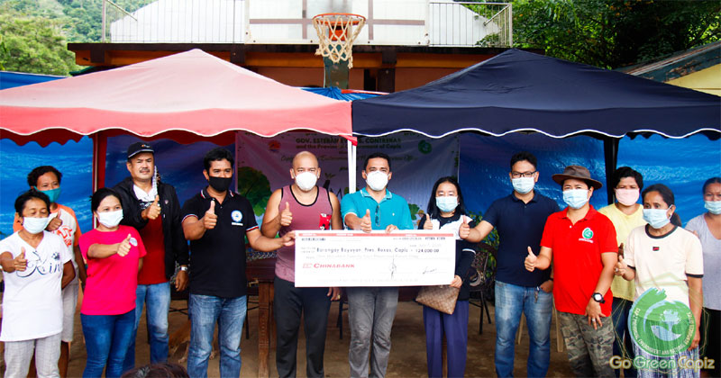 Capiz Governor Esteban Evan B. Contreras, assisted by Mayor Receliste Escolin, SB Member Lalaine Badana-Young, MENRO Designate Hansel Bereber, SM Prime Holdings, Inc. Project Engineer Tino Solidum and Acting CaPENRO Atty. Abeb Arboleda-Depon led the symbolic turnover of the financial assistance to Ms. Mary Jane Estrella, ISF President of Bayuyan Integrated Social Forestry Beneficiaries and Punong Barangay Rudolph Estrella of Brgy. Bayuyan in the said municipality.