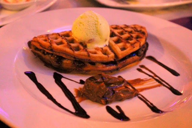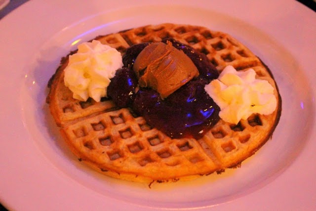 | Belgian Waffle Dulce de Leche with Blueberries and Pistachio Ice Cream |