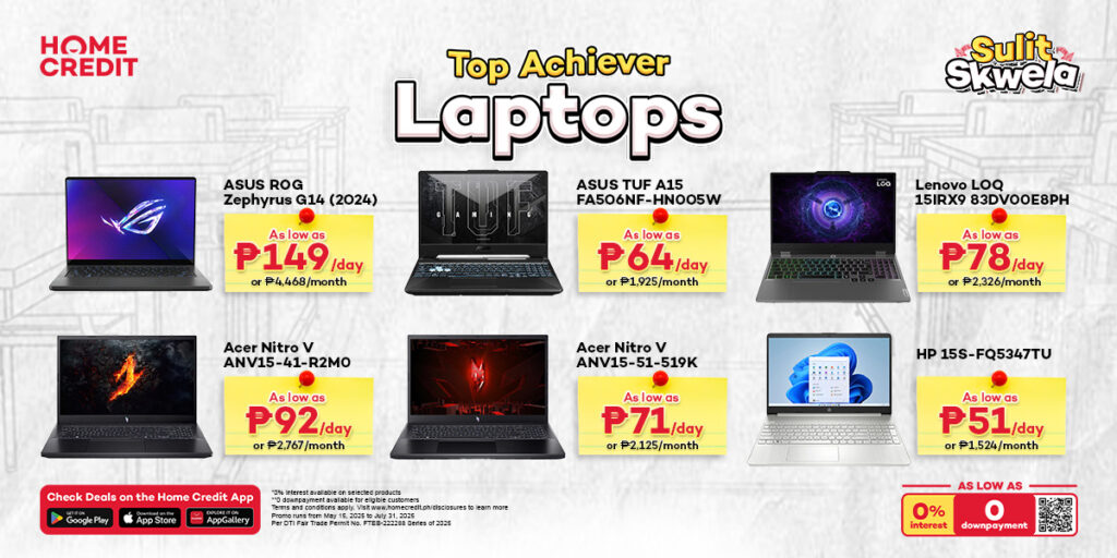 - Lenovo LOQ – Nagagamit sang Intel Core i5-13450HX processor, ini nga Luna Grey laptop may maayo gid nga performance para sa schoolwork kag gaming, kag AI features nga naga-optimize sang settings depende sa imo paggamit. May ara ini 8GB RAM, 512GB storage, kag 15.6-inch display nga may nipis nga bezels para mas immersive ang viewing experience. May rapid charging support para mas hapos dal-on sang mga estudyante. Mabakal mo ang Lenovo LOQ sa ₱78 kada adlaw ukon ₱2,326 kada bulan sa 18 ka bulan paagi sa Home Credit. SRP: ₱57,995.