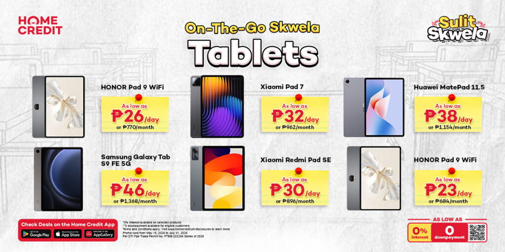 - Honor Pad 9 WiFi with Keyboard Tablet – Gin-disenyo para sa mga estudyante nga nagakinahanglan sang mamag-an kag versatile nga device, ang Honor Pad 9 angay gid para sa pagbasa, pagkuha nota, research, kag pag-attend sang online classes. May ara ini nga daku nga 12.1-inch 120Hz 2.5K Eye Protection Display, 256GB nga storage, kag 8GB nga RAM nga ginapadalagan sang Snapdragon 6 Gen 1 chipset—nga kaya gid mag-handle sang adlaw-adlaw nga buluhaton sa eskwelahan. Ang 8300mAh nga battery naga-offer sang isa ka adlaw nga gamit, nga naga-minos sang kinahanglanon mag-charge pirme. May upod nga detachable keyboard, ini nga elegante nga tablet nagahatag sang laptop-like experience sa mas portable nga porma—angay para sa mga estudyante nga permi nagabyahe. Makabulig man ini para sa mga manunudlo nga nagakinahanglan sang mag-an nga device para sa pagtudlo, pagpresentar, ukon pagtan-aw sang online modules. Mabakal ini nga Honor Pad 9 WiFi with Keyboard Tablet sa Home Credit sa ₱26 kada adlaw ukon ₱770 kada bulan sulod sang 18 ka bulan, nga may retail price nga ₱17,999.