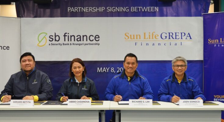 The agreement was signed by Sun Life Grepa President Richard S. Lim and Vice President for Affinity Marketing Joen Songco, along with SB Finance President and CEO Abbie Dans-Casanova and Chief Business Officer Gerard Betita.