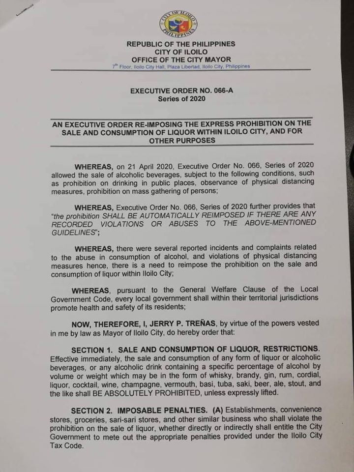 In a Facebook post, Mayor Jerry T. Treñas said that he will issue an order on Wednesday morning reimposing the liquor ban. Here’s the full post: