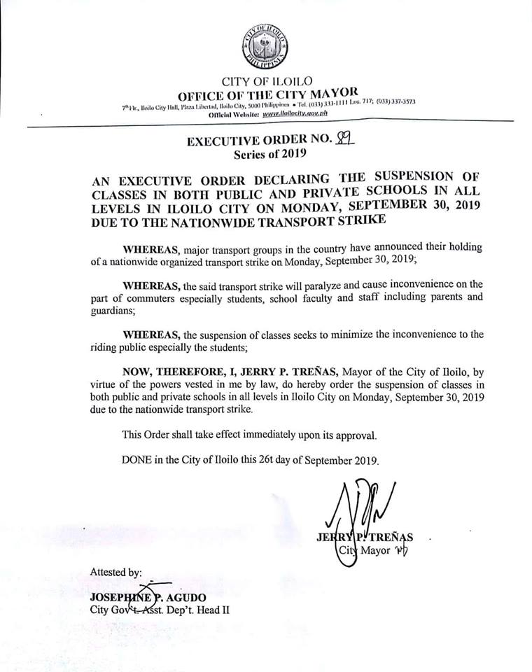 NOW, THEREFORE, I, JERRY P. TREÑAS, Mayor of the City of Iloilo, by virtue of the powers vested in me by law do hereby order the suspension of classes in both public and private schools in all levels in Iloilo City on Monday, September 30, 2019 due to the nationwide transport strike.