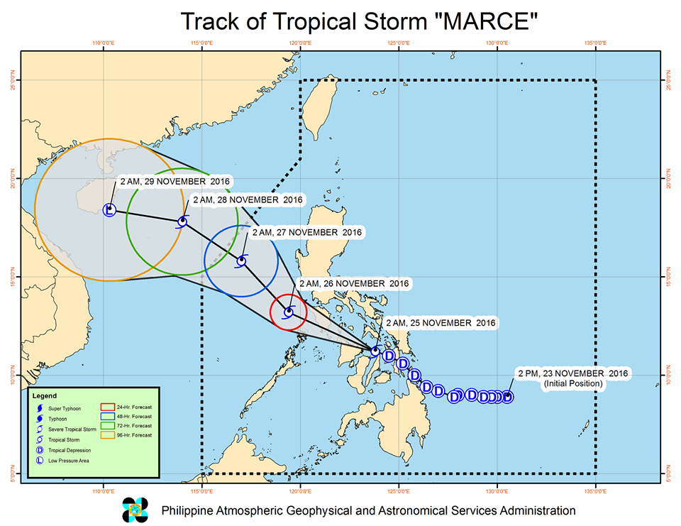 In a severe weather bulletin no. 13 issued at 5:00AM of November 25, 2016, Pagasa detailed that center of tropical storm Marce was estimated based on all available data at 85 km East Southeast of Roxas City, Capiz(11.2°N, 123.4°E).