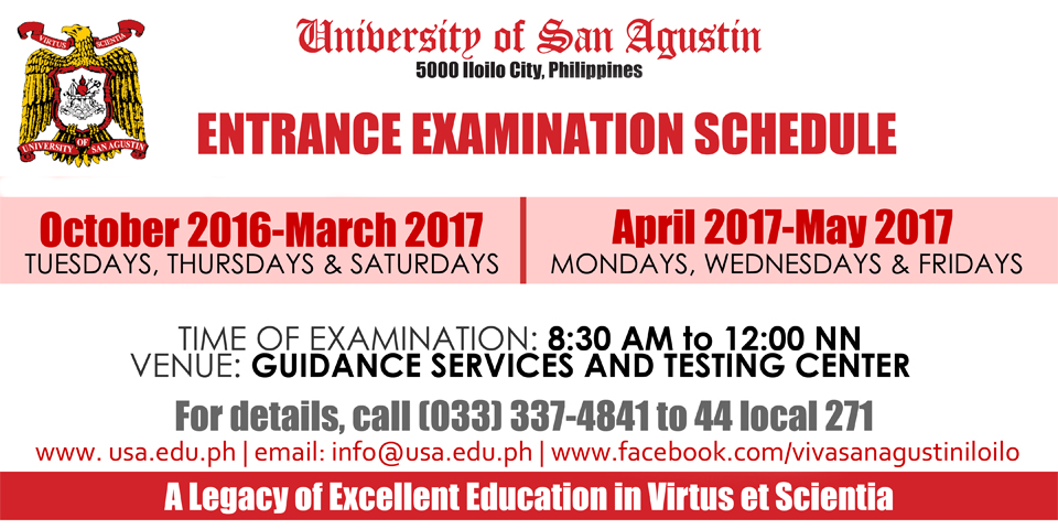 The University of San Agustin in Iloilo City conducts Entrance Examination for incoming freshmen, and here are the schedule and requirements for applicants.