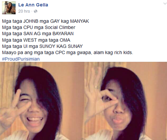 Facebook user Le Ann Gella posted on Wednesday distasteful remarks against students of John B. Lacson Maritime University, Central Philippine University, University of San Agustin, West Visayas State University and University of Iloilo. The post reads: