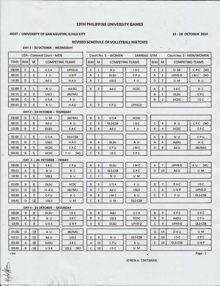University of San Agustin (USA) hosts the 2014 UniGames which will officially open today, October 21, 2014. Check the schedule of Men’s and Women’s Volleyball tournament below.